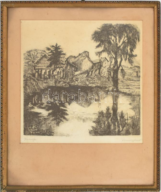 Leírás: Remsey Jenő (1885-1970): Faluvége. Rézkarc, papír, jelzett. Kissé foltos. Üvegezett fakeretben, 31×31 cm