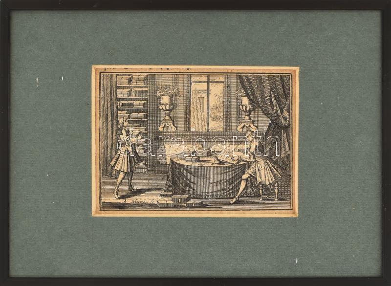 Leírás: Andreas Nunzer (1696-1754): Rokokó jelenet, Rézmetszet, papír, jelzett a metszeten. 7x9 cm. Keretben.
