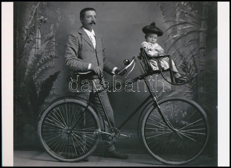 Leírás: cca 1920 Gyermekülés egy régi bringán. műtermi felvétel, 1 db modern nagyítás, jelzés nélkül, 15x21 cm