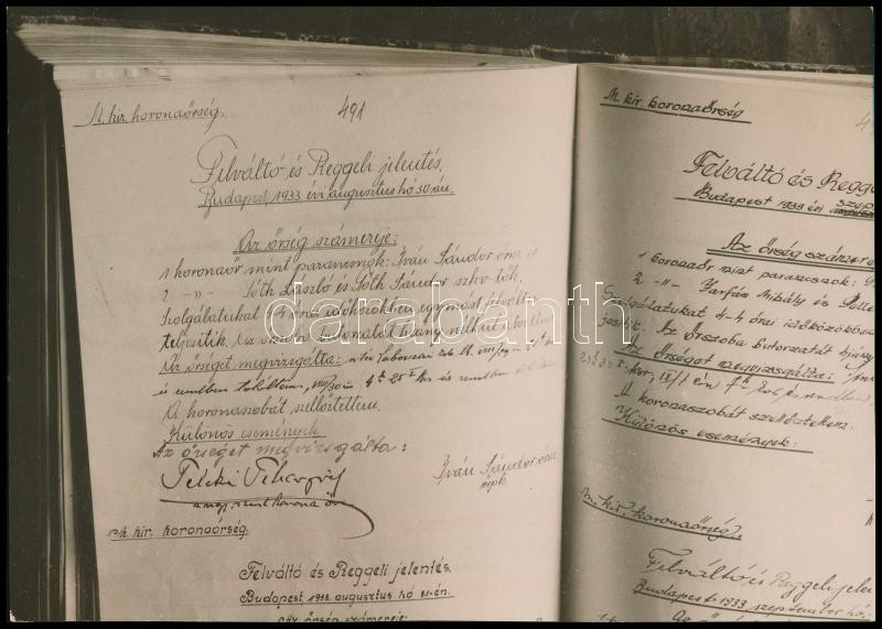 Leírás: cca 1930-1940 Szendrő István (1908-2000): Részlet a koronaőrség jelentéseiből, hátoldalon pecséttel jelzett fotó, 11,5×17,5 cm