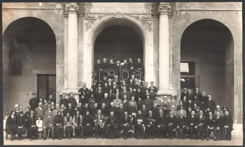 cca 1930 2 db vatikáni csoportkép, Rott Nándor (1869-1939) veszprémi püspök, Langmár Lipót (1895-1979) és más beazonosítandó egyházi és polgári személyek társasága, G. Felici római fényképész jelzett fotói, egyik foltos, másikon kisebb szakadással, 23x38 cm.