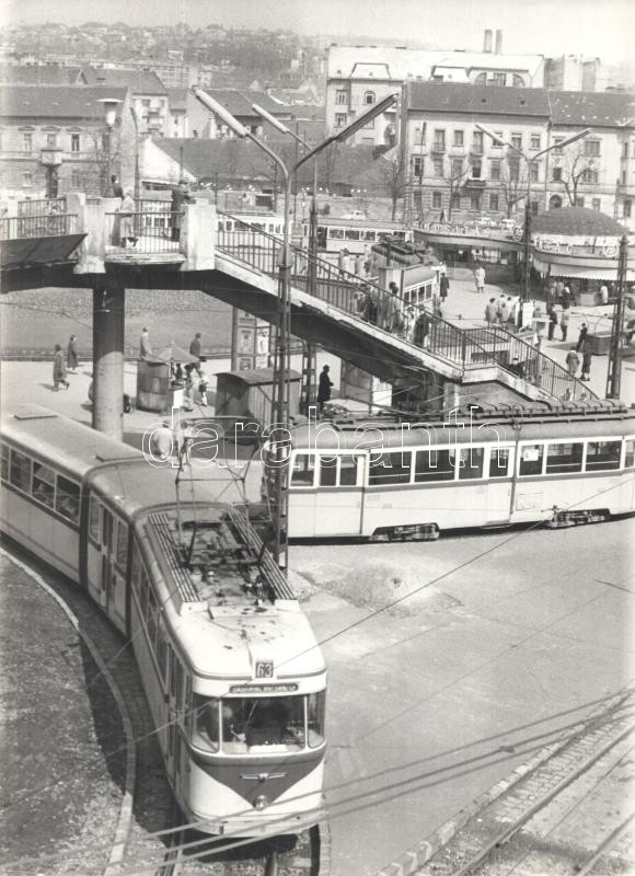 cca 1970 Budapest, Moszkva tér tele villamosokkal, hátoldalon feliratozott fotó "Modern közlekedés" felirattal, jó állapotban, néhány kisebb törésnyommal, 29,5×21,5 cm