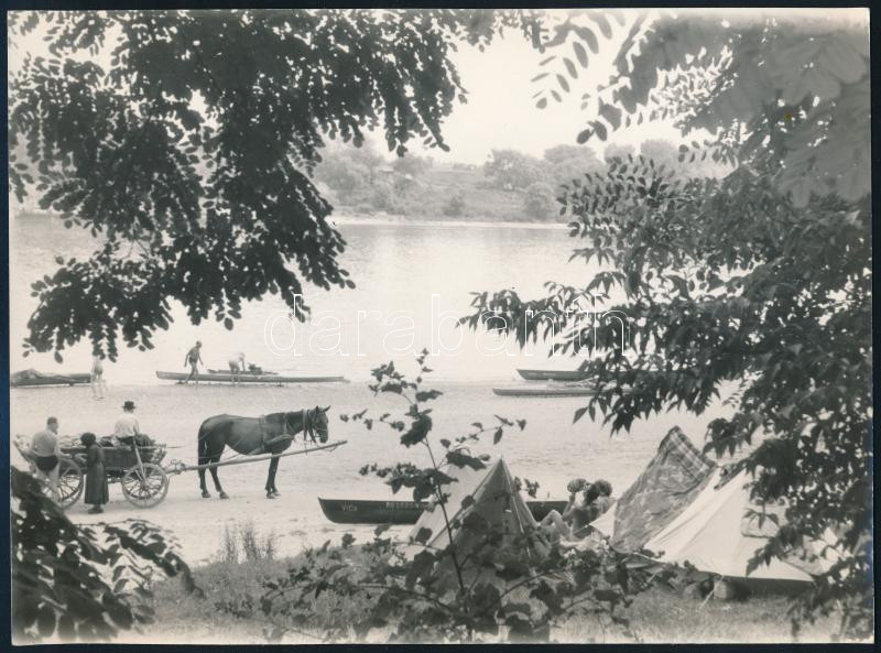 Leírás: cca 1970 "Vikend a Dunán", kishajókkal, sátorral, lovaskocsin áruló öregekkel, fotó, jó állapotban, 17,5×23,5 cm