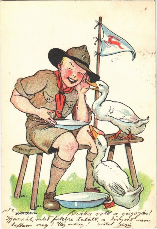 Cserkész libákkal. A Magyar Cserkészszövetség kiadása / Hungarian boy ... https://www.darabanth.com/hu/475-Gyorsarveres/475.0/Kepeslapok/Cserkesz~1500020/Cserkesz-libakkal-A-Magyar-Cserkeszszovetseg-kiadasa-Hungarian-boy-scout-art-postcard-s-MC3~II2377703