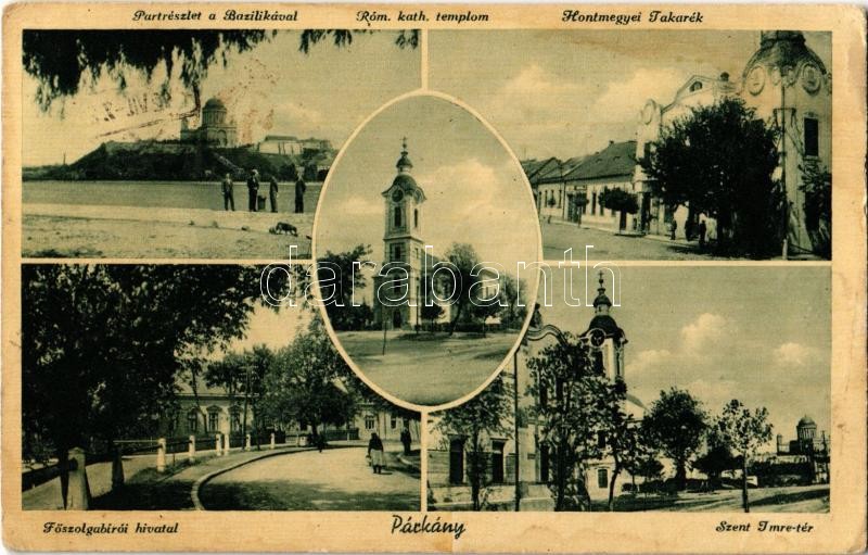1942 Párkány, Stúrovo; Part részlet a Bazilikával, Római katolikus templom, Hont megyei Takarékpénztár, Főszolgabírói hivatal, Szent Imre tér / riverside, Basilica, Catholic church, savings bank, chief constable's office, square (EK)