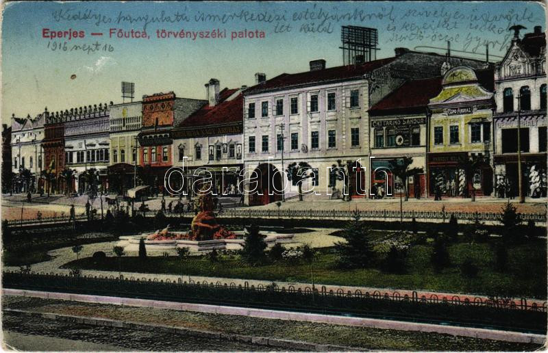 Eperjes, Presov; Fő utca, Törvényszéki palota, Ambrózy Béla, Gerő Mihály, Cattarino Sándor utóda Földes Samu üzlete és saját kiadása / main street, court, shops (EK)