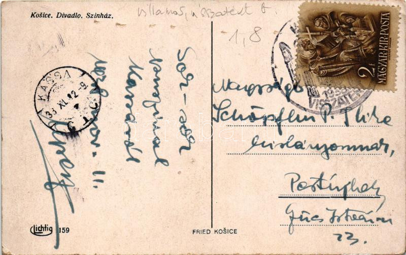 Leírás: Kassa, Kosice; Divadlo / színház, villamos / theatre, tram + "1938 Kassa visszatért" So. Stpl. (EK)