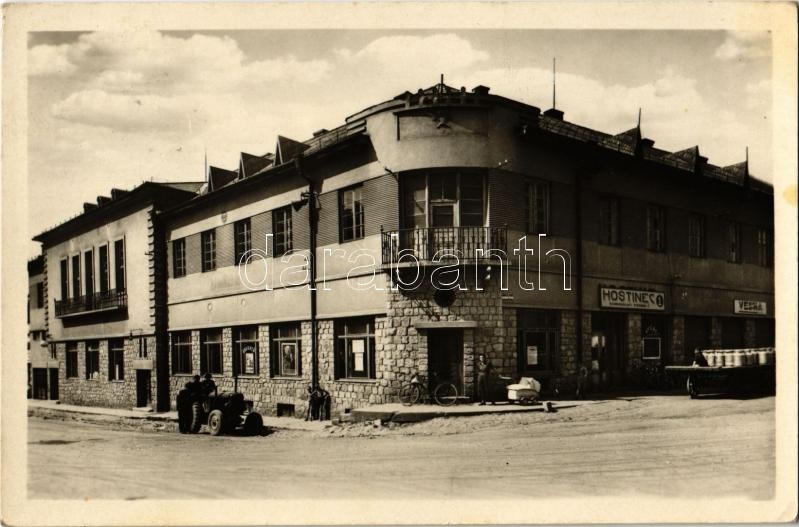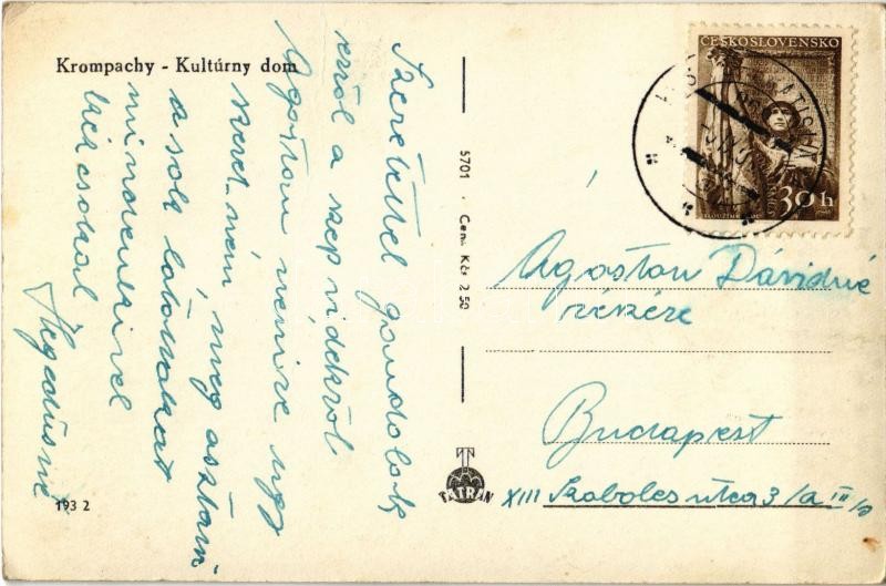 Korompa, Krompach, Krompachy; Kultúrny dom / Kultúrház, traktor, vendéglő, üzlet, kerékpár / community center, tractor, restaurant, inn, shop, bicycle (EK)