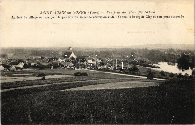 Saint-Aubin-sur-Yonne, Vue prise du coteau Nord-Ouest, Au-delá du village on apercoit la jonction du Canal de dérivation et de l'Yonne, le bourg de Cézy et son pont suspendu / general view, channel