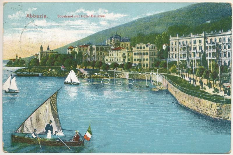 1911 Abbazia, Opatija; Südstrand mit Hotel Bellevue (fl) https://www.darabanth.com/hu/475-Gyorsarveres/475.0/Kepeslapok/Horvatorszag~1500009/1911-Abbazia-Opatija-Sudstrand-mit-Hotel-Bellevue-fl~II3063359