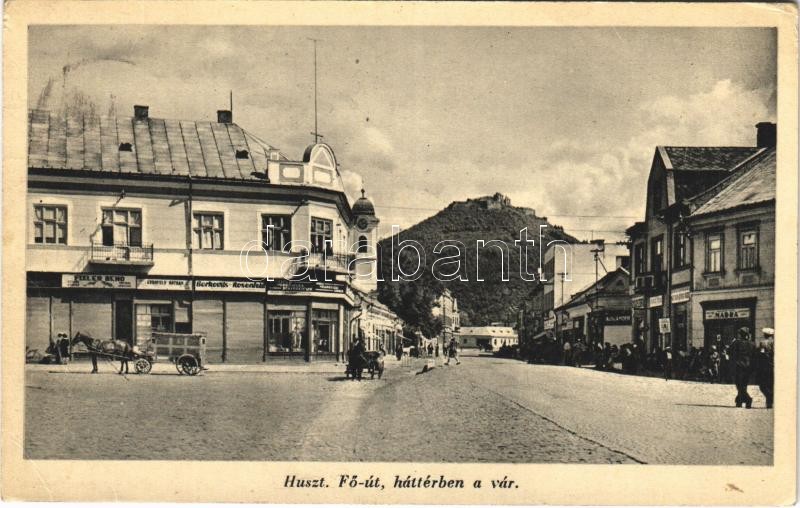 Leírás: 1939 Huszt, Chust, Khust; Fő utca, háttérben a vár, Fixler Benő, Grünfeld Náthán, Berkovits és Rosenfeld, Ausländer üzlete / main street, castle ruins, shops (EK)