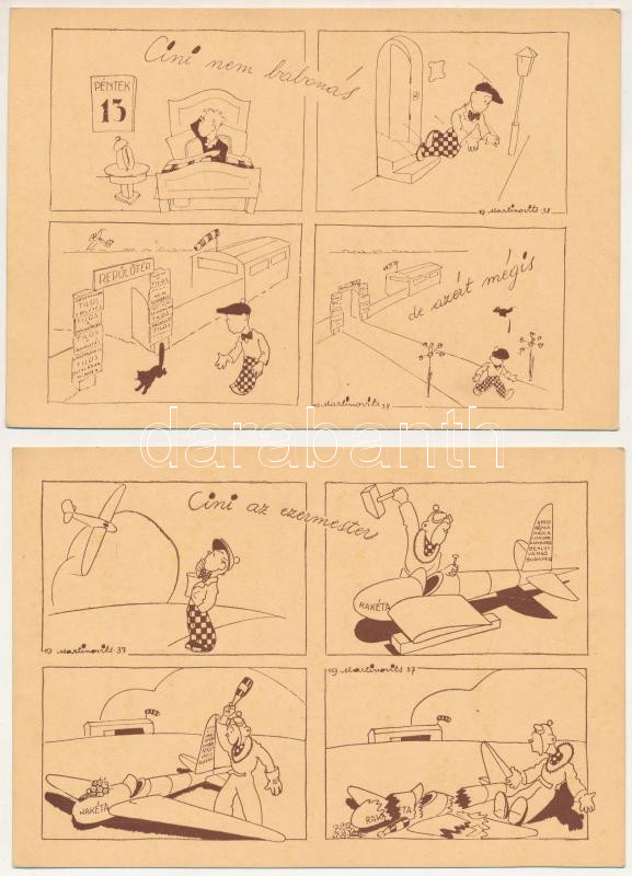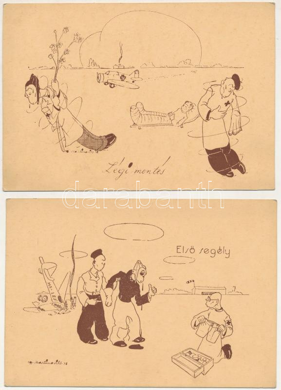 4 db RÉGI második világháborús, humoros magyar légierős grafikai képeslap pilótákkal és repülőgépekkel, Martinovits szignóval / 4 pre-1945 WWII era Hungarian airforce humorous postcards, signed by Martinovits