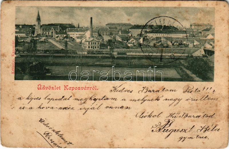 Leírás: 1900 Kaposvár, látkép, vasútállomás, városi villanytelep, vonat. Kéthelyi kiadása (fl)