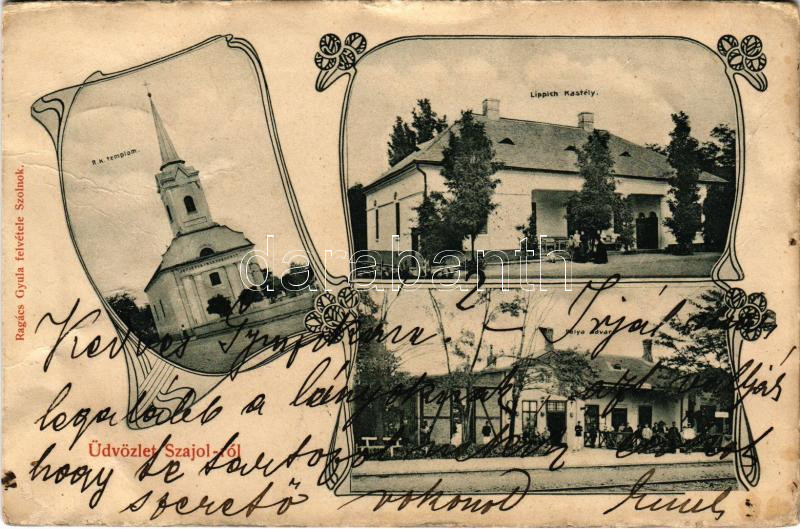 1903 Szajol (Alföld), Római katolikus templom, pályaudvar, régi vasútállomás, Lippich Gusztáv vármegyei főispán kastélya. Ragács Gyula felvétele (Szolnok), Art Nouveau (fa)