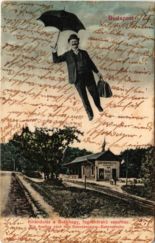 Leírás: 1904 Budapest XII. Széchenyi hegyi vasútállomás, Kirándulás a Svábhegyi Fogaskerekű vasúthoz. Montázs repülő úriemberrel esernyővel (fl)