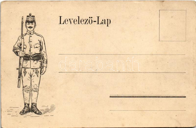 Leírás: Eger, laktanya udvara K.u.K. katonákkal. Baross nyomda (fl)