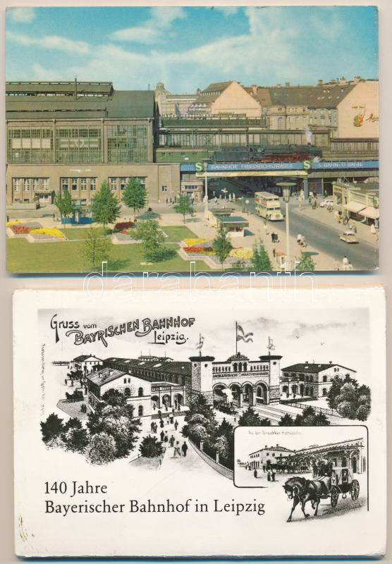 16 db MODERN vasúti motívum képeslap: mozdonyok, vonatok, állomások + 11 db képeslap tokban / 16 modern railway motive postcards: locomotive, train, railway stations + 11 Liepzig railway station postcards in case (Bayerischer Bahnhof in Leipzig)