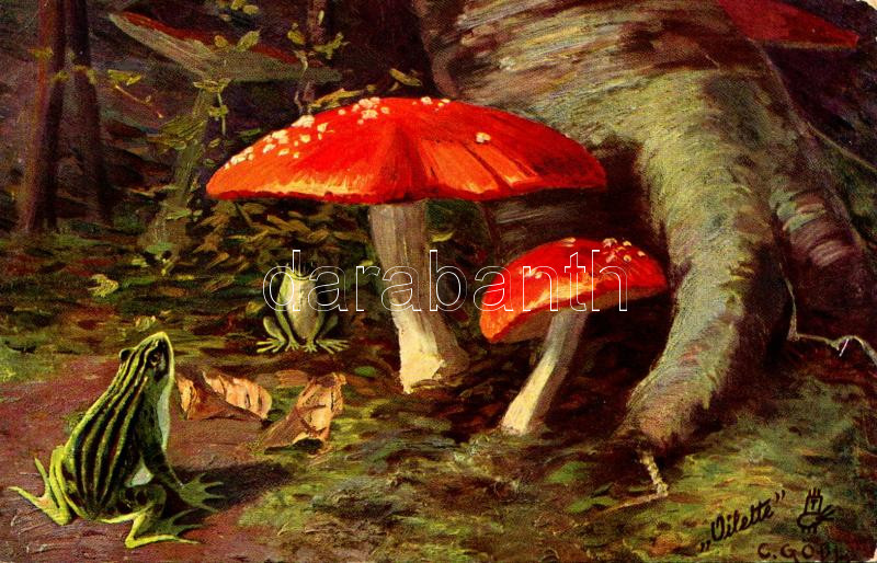 Leírás: Forest, frogs with mushrooms. Raphael Tuck & Sons. Oilette Serie "Glückspilze" No. 471 B. nach Originalen von C. Göbl. (Kkpott sarkak / worn corners)