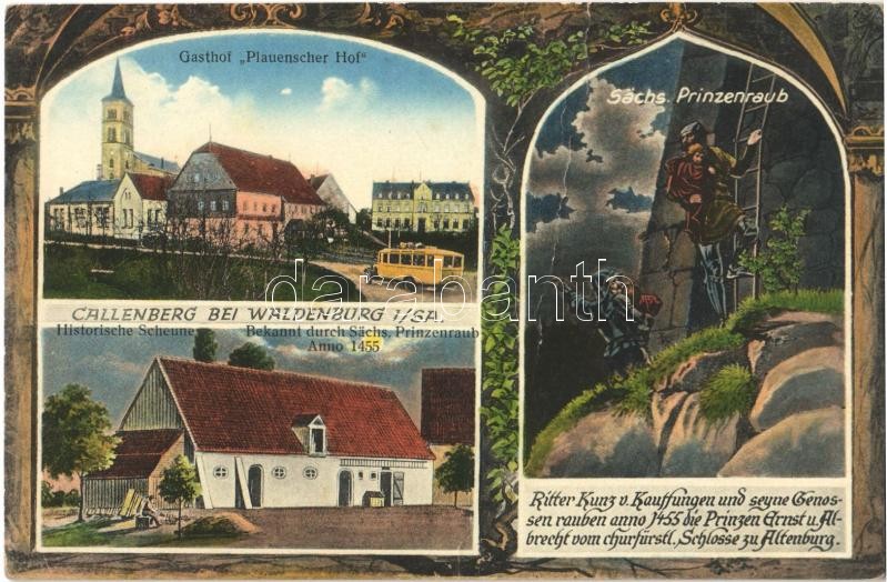 Leírás: Callenberg bei Waldenburg, Gasthof "Plauenscher Hof", Historische Scheune, Sächs. Prinzenraub / hotel and restaurant, autobus. Art Nouveau (fa)