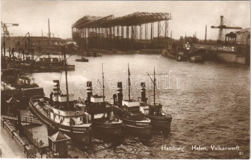 Hamburg, Hafen, Vulkanwerft / port, dock, Vulkan shipyard, steamships https://www.darabanth.com/hu/475-Gyorsarveres/475.0/Kepeslapok/Nemetorszag~1500112/Hamburg-Hafen-Vulkanwerft-port-dock-Vulkan-shipyard-steamships~II2348686