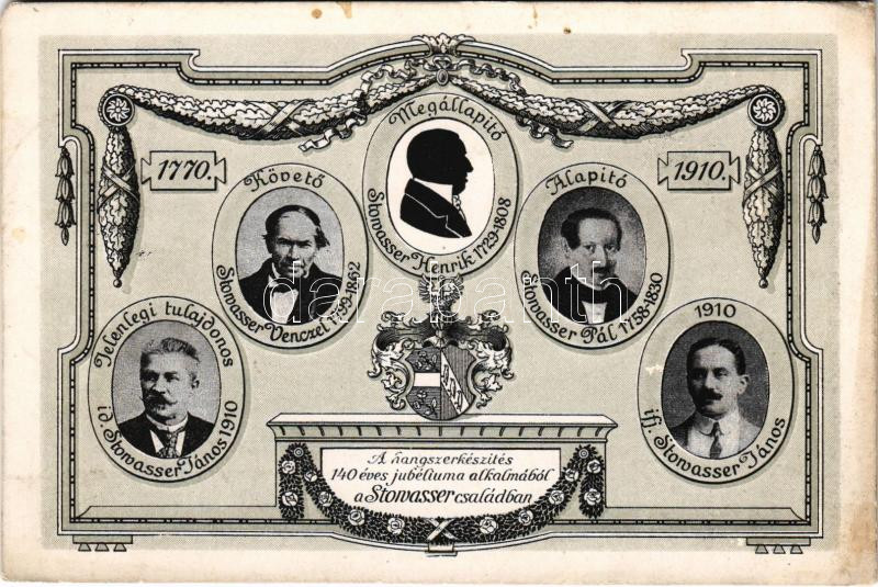 1770-1910 A hangszerkészítés 140 éves jubileuma alkalmából a Stowasser családban. Stowasser János csász. és kir. udvari hangszergyár reklámlapja, családfa / Hungarian musical instrument factory advertisement, family tree, memorial (EM)