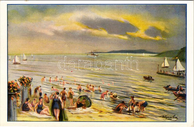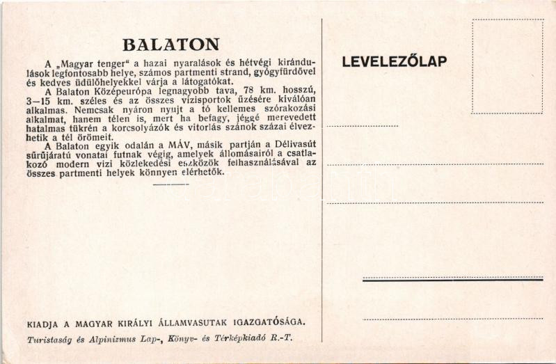 Balaton - A "Magyar tenger". A Magyar Királyi Államvasutak (MÁV) turisztikai reklám képeslapja / Hungarian State Railways tourism campaign advertisement s: Wágner Géza (EK)
