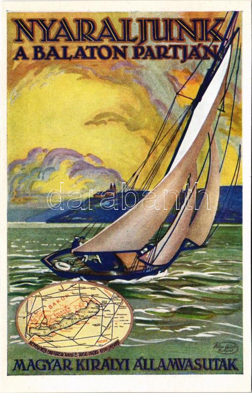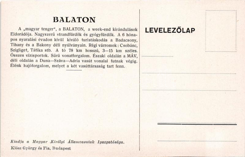 Nyaraljunk a Balaton partján! A Magyar Királyi Államvasutak (MÁV) turisztikai reklám képeslapja. Klösz György és Fia / Hungarian State Railways tourism campaign advertisement