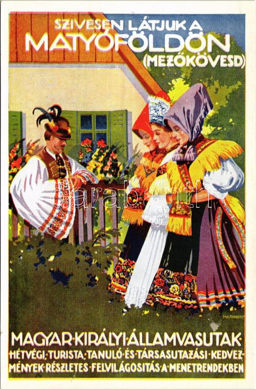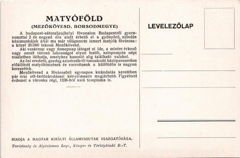 Szívesen látjuk a Matyóföldön (Mezőkövesd). A Magyar Királyi Államvasutak (MÁV) vasúti turisztikai reklám képeslapja. Klösz György és Fia / Hungarian State Railways tourism campaign advertisement s: Haranghy