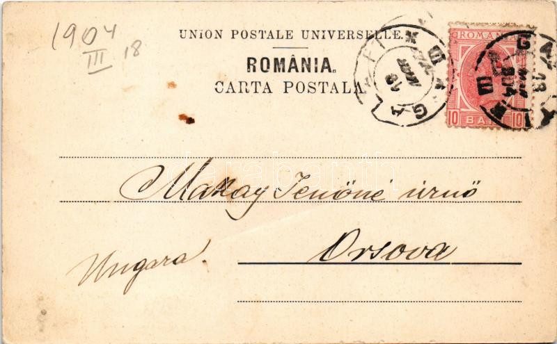 Leírás: 1904 Galati, Galatz; Piata Regala cu Strada Mare / street view, tram, shops. Edit. Anton Pappadopol. Fot. G. Maksay (small tear)