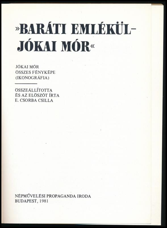 Leírás: ,,Baráti emlékül - Jókai Mór." Jókai Mór összes fényképe. Összeáll. és az előszót írta: E. Csorba Csilla. Fotótéka. Bp., 1981, Népművelési Propaganda Iroda. Fekete-fehér fotókkal illusztrálva. Kiadói papírkötés.
