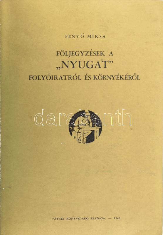 Fenyő Miksa: Följegyzések a "Nyugat" folyóiratról és környék... https://www.darabanth.com/hu/475-Gyorsarveres/475.0/Konyvek/Konyvek-Egyeb-ritkasagok~1000037/Fenyo-Miksa-Foljegyzesek-a-Nyugat-folyoiratrol-es-kornyekerol-Niagara-Falls-1960-PC3~II3188584