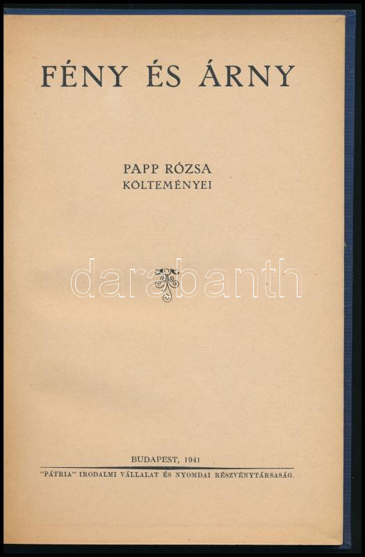 Papp Rózsa: Fény és árny. - - költeményei. Bp., 1941, "Pátria&quo... https://www.darabanth.com/hu/475-Gyorsarveres/475.0/Konyvek/Konyvek-Egyeb-ritkasagok~1000037/Papp-Rozsa-Feny-es-arny--koltemenyei-Bp-1941-Patria-95plus1-p-Aranyozott-egeszvC3~II3224585