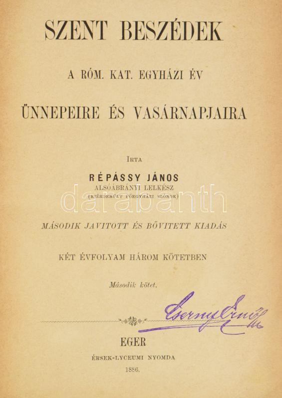 Répássy János: Szent Beszédek a róm. kat. egyházi év ünnepeire és vasárnapjaira I.-II.. Eger, 1886. Érseki Líceumi nyomda, 425 + 2 p.; 437 + 2 p. Korabeli aranyozott gerincű félbőr kötésben, megkímélt állapotban. Ritka!