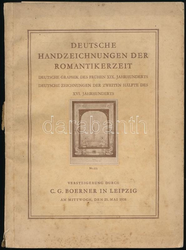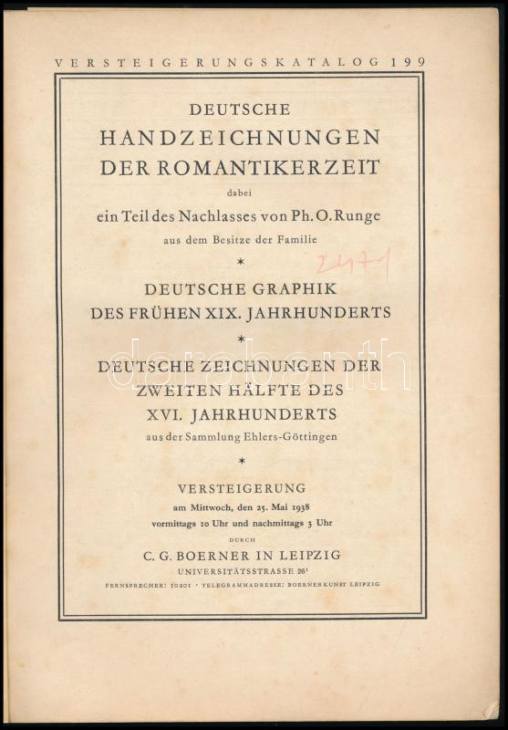 Deutsche Handzeichnungen der Romantikerzeit, dabei ein Teil des Nachlasses von Ph. O. Runge aus dem Besitz der Familie. Deutsche Graphik des frühen XIX. Jahrhunderts. Deutsche Zeichnungen der zweiten Hälfte des XVI. Jahrhunderts aus der Sammlung Ehlers-Göttingen. Auktionskatalog 199 der Fa. C. G. Boerner für die Auktion am 25. Mai 1938. Lipcse, 1938, k.n.. 56 p. + XXXVIII t. (fénynyomatú reprodukciók). Külön lapon becsárakkal. Német nyelven. Kiadói papírkötésben, sérült gerinccel, foltos borítóval.