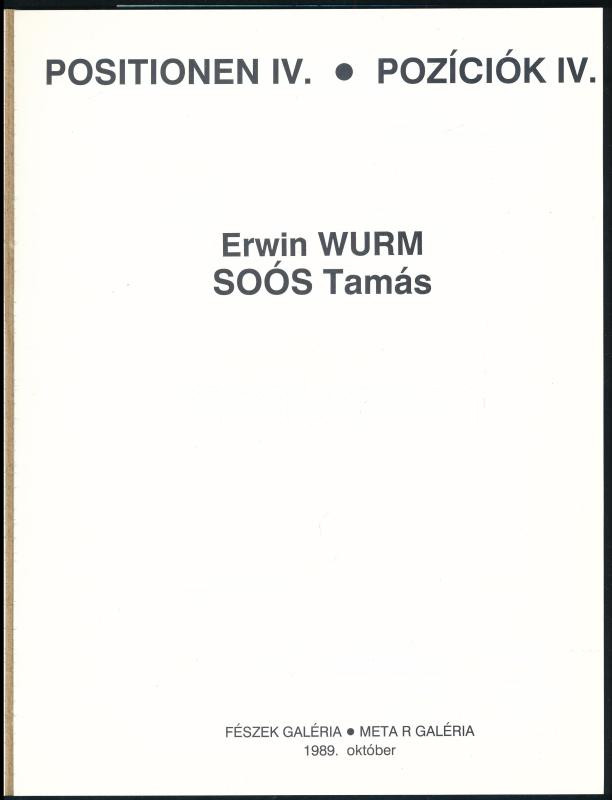 Leírás: Erwin Wurm - Soós Tamás (Pozíciók IV.) Bp., 1989. Fészek Galéria, Meta R. Galéria. Kiállítási katalógus Kiadói papírkötésben