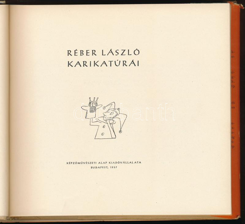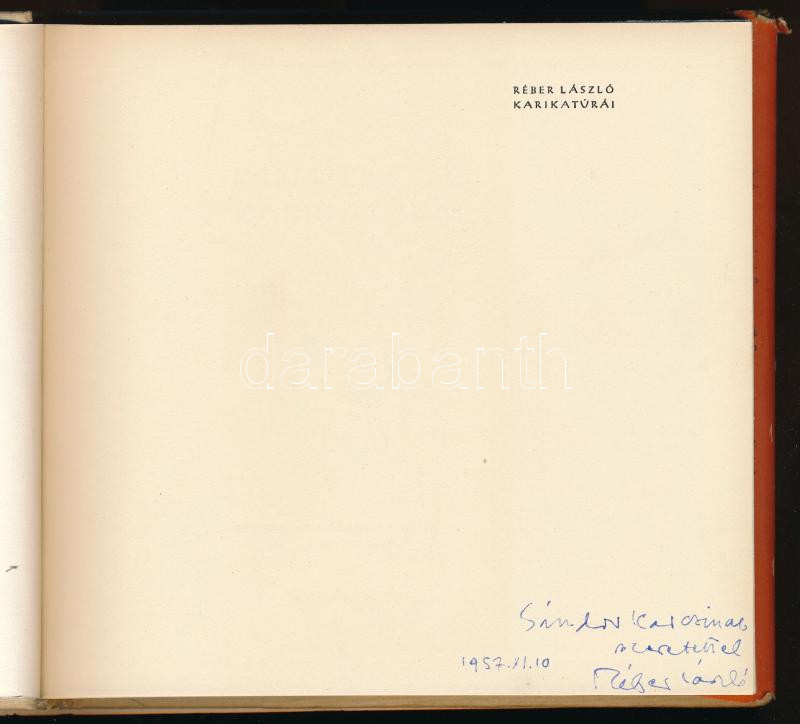Réber László karikatúrái. A művész, Réber László (1920-2001) Munkácsy Mihály-díjas grafikusművész, illusztrátor, karikaturista által Sándor Károly (1915-1960) karikaturista, grafikus DEDIKÁLT példány. Bp., 1957., Képzőművészeti Alap. Kiadói félvászon-kötés, kiadói papír védőborítóban.
