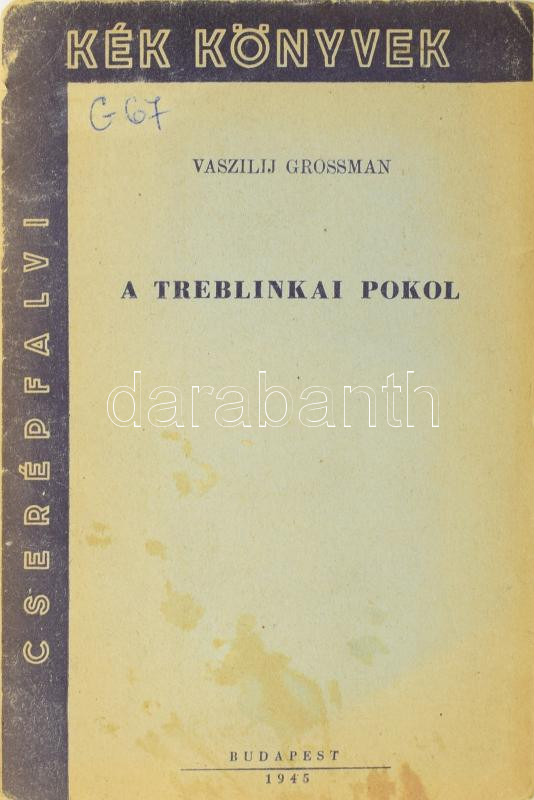 Grossman, Vaszilij: A treblinkai pokol. Bp., 1945, Cserépfalvi, 62+(2) p. Első magyar nyelvű kiadás. Kiadói papírkötés, kissé fakó, foltos borítóval, intézményi bélyegzőkkel, nagyrészt felvágatlan.