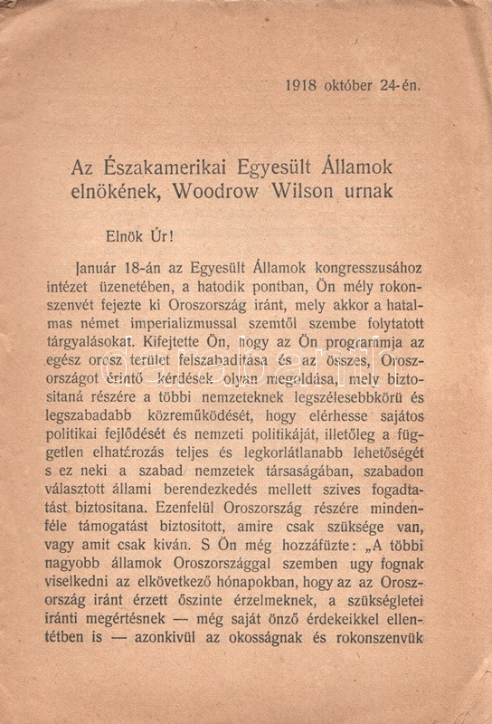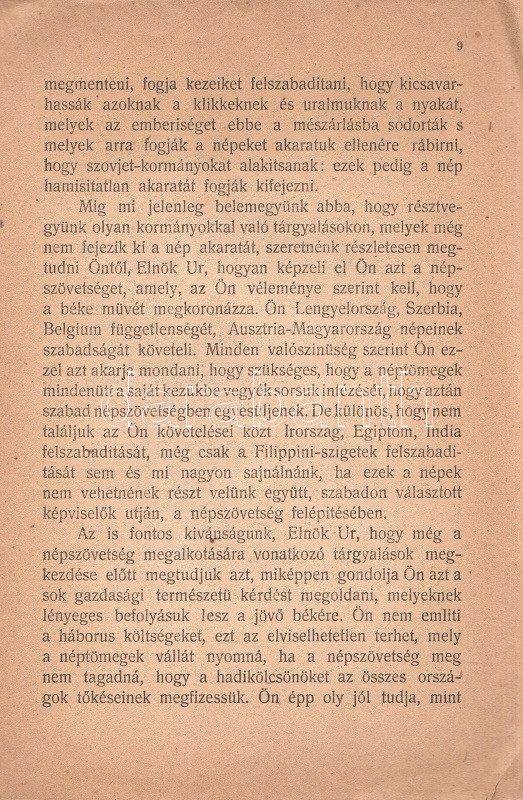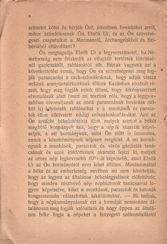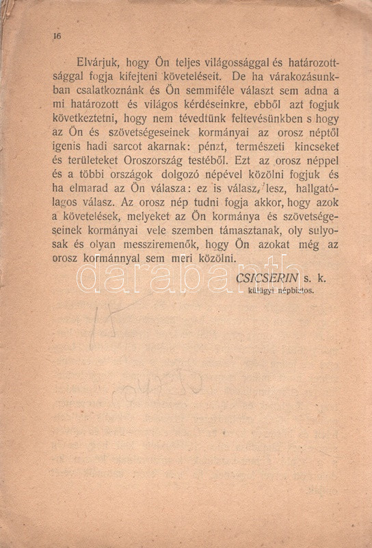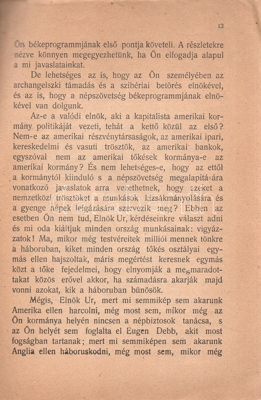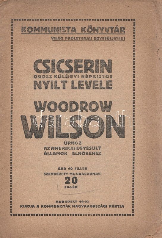 Csicserin orosz külügyi népbiztos nyílt levele Woodrow Wilson úrhoz, az Amerikai Egyesült Államok elnökéhez. Budapest, 1919. Kommunisták Magyarországi Pártja. 16 p. Az arisztokrata származású Georgij Vasziljevics Csicserin (1872-1936) fiatal korától kezdve támogatta a forradalmi mozgalmakat, így az 1905-ös oroszországi felbolydulást is. Ennek bukása után külföldre távozott. A világháborús időszak orosz emigránsaként hevesen ellenezte a háborút, már emigrációjában felvette a kapcsolatot az orosz forradalmi irányzatokkal, a szovjet fordulat második évétől, 1918-tól pedig már a szovjet állam külügyi népbiztosa volt. A népek önrendelkezési elvét képviselő amerikai elnöknek, Woodrow Wilsonnak küldött nyílt levele 1918 októberéből származik, és számon kéri az amerikai elnökön a wilsoni önrendelkezési elvet, melyet az antant 1918. évi katonai intervenciója megsértett (az antant brit, amerikai, francia és japán csapatai Murmanszknál, Arhengelszknél, illetve a Távol-Keleten partra szállva a fehérek mellett szálltak be a szovjet-oroszországi polgárháborúba). A levél emlékezetes bepillantást nyújt a nyájassággal kevert fenyegetés hangnemével jellemezhető korai szovjet diplomáciai beszédmódba. Csicserin a szovjet önrendelkezés és államirányítás elveinek kinyilvánítása mellett elhelyez néhány burkolt fenyegetést a tőkések és az imperialisták ellen - és kilátásba helyezi annak a lehetőségét, hogy a pattanásig feszült poszt-háborús helyzetben szovjet mintájú hatalomátvétel akármikor akármely államban végbemehet: akár az Egyesült Államokban is szétzúzható a tőkés rendszer, mely szovjet érvelés szerint az elhúzódó háború temérdek szenvedésének kizárólagos okozója. (Kommunista könyvtár.) Fűzve, kiadói borítóban, az első fedőborítón apró gyűrődéssel.