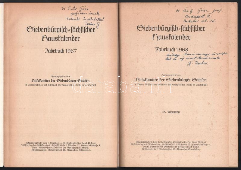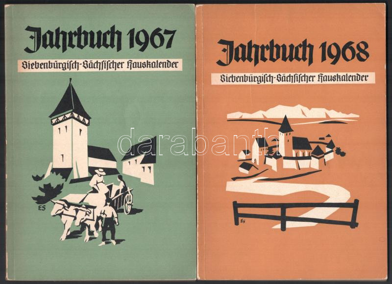 1967-1968 Siebenbürgisch-Sächsischer Hauskalender. München, Hilfskomitee der Siebenbürger Sächsen, 144+6 p.;144+6 p. Német nyelven. Fekete-fehér fotókkal. Kiadói papírkötések, a 1968-as gerince elvált a borítótól.