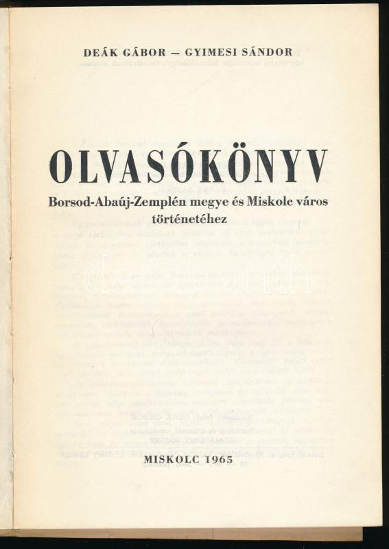 Deák Gábor - Gyimesi Sándor: Olvasókönyv Borsod-Abaúj-Zemplén megye és Miskolc város történetéhez. Miskolc, 1965. Kiadói papírkötés, gerincnél levált, kopottas állapotban.