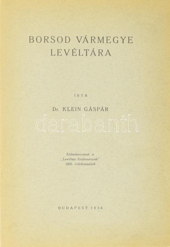 Dr. Klein Gáspár: Borsod vármegye levéltára. (Dedikált!) Különlenyomat a ,,Levéltári Közlemények" 1935. évfolyamából. Bp., 1936, szerzői kiadás (Sárkány-ny.), 52 p. Kiadói tűzött papírkötés, jó állapotban. A szerző, Klein (Benedekfalvi) Gáspár (1903-1970) levéltáros által Marjalaki Kiss Lajos (1887-1972) régész-történész, geográfus, Miskolc-kutató, a Magyar Földrajzi Társaság miskolci osztályának alapító tagja részére dedikált példány.