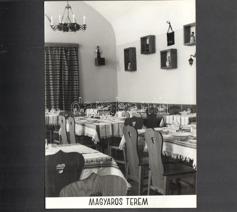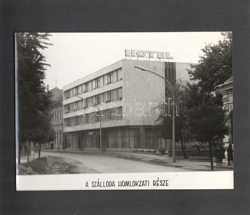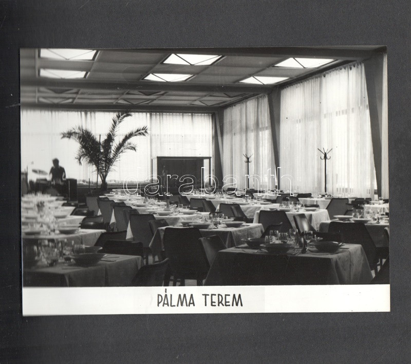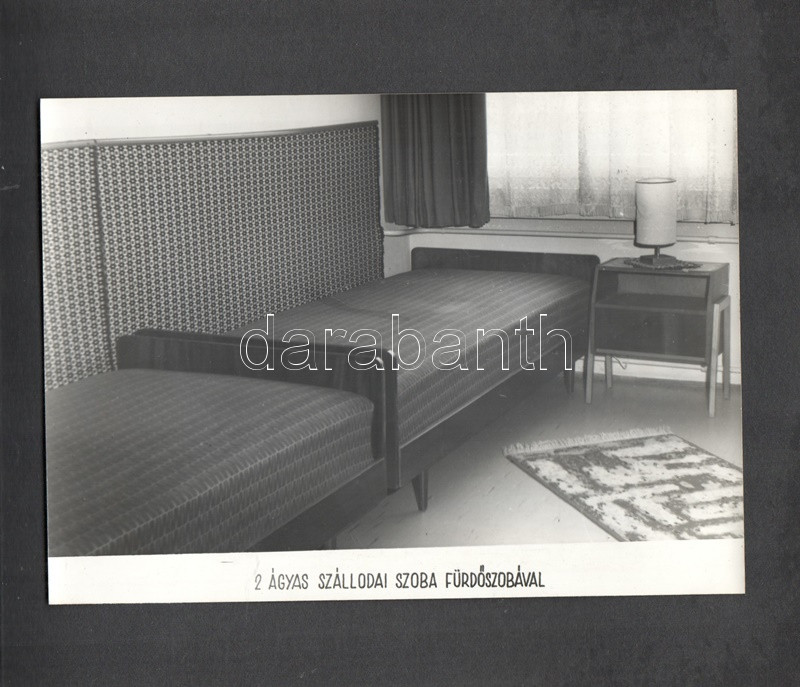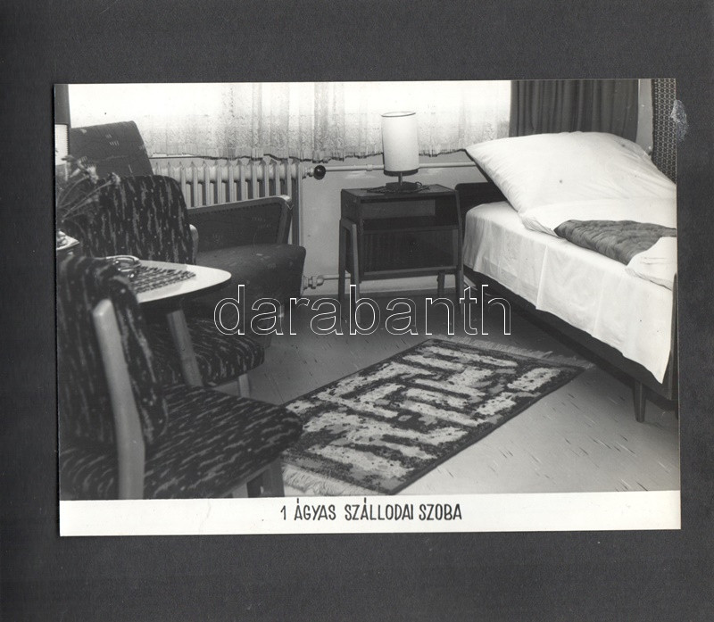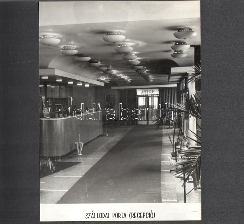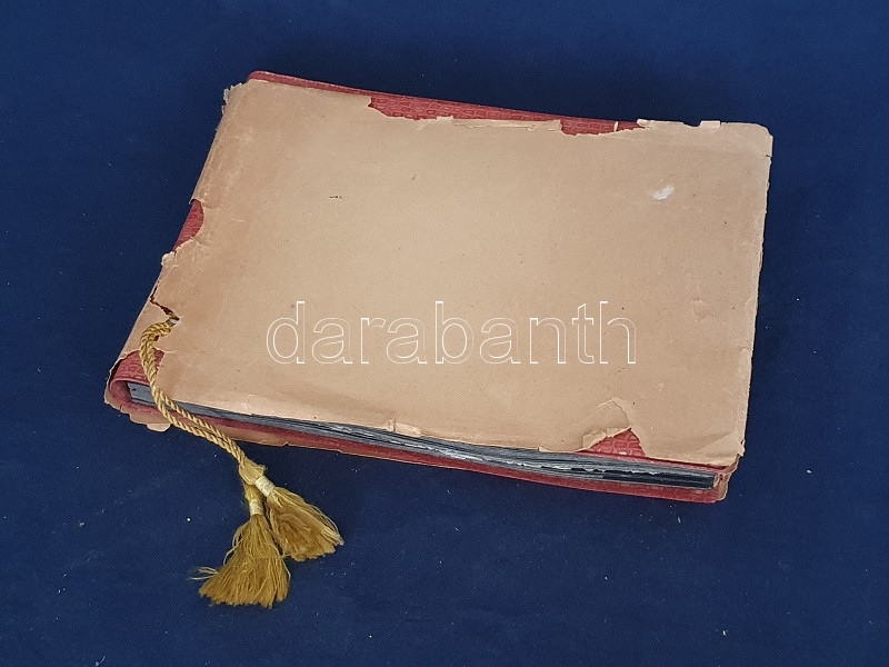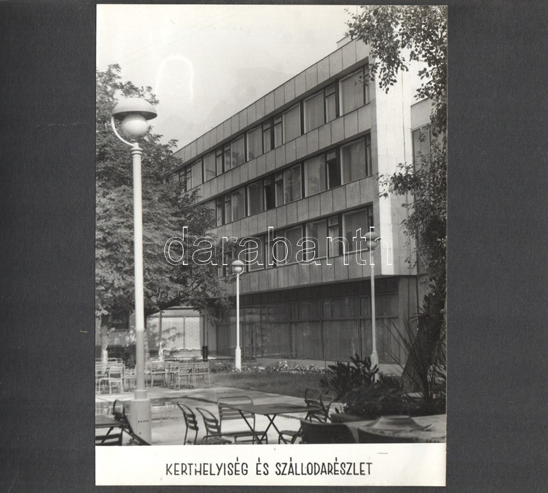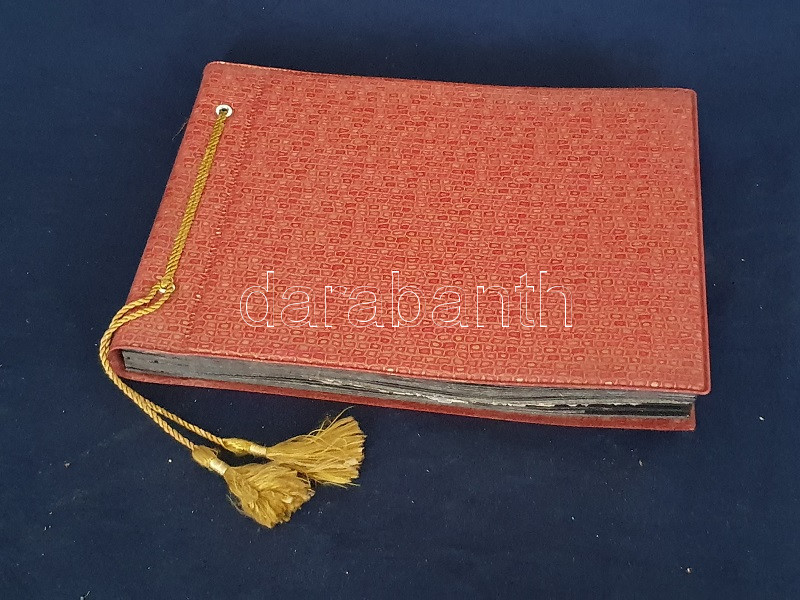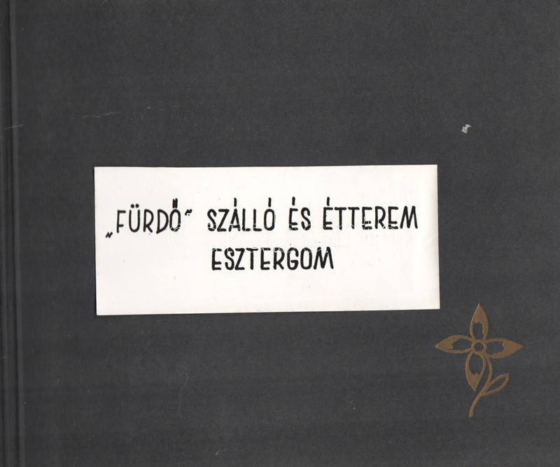 [Fotóalbum] Az esztergomi ,,FürdÅ‘" Szálló új szárnyának feliratozott fényképalbuma. (1967) Esztergom, 1967 körül. [20] táblán 20 feliratozott, felragasztott vintázs fénykép. Haránt alakú album. Fényképalbumunk a nagy múltra visszatekintÅ‘ esztergomi FürdÅ‘ Szállóhoz épÃtett új szállodai szárny archÃv fotóalbuma. Esztergomban a helyi termálforrásokra támaszkodva 1842-ben épült meg a vidék elsÅ‘ szállodája, a klasszicista stÃlusban emelt Szent István FürdÅ‘ és Szálloda. A szállótól elkülönülten korábban is álltak melléképületek, az 1960-as években merült fel az épületegyüttes összekötése egy új, modern stÃlusban épÃtendÅ‘ új szállodai szárnnyal. Az 1964-1966 között kivitelezett modern szárny - melynek teljes homlokzati felvétele a harmadik oldalon található - három emeleten 60, fürdÅ‘szobával ellátott szobát kÃnált, összesen 120 férÅ‘hellyel. A szálloda éttermét, recepcióját és hallját a régi épületbe is átvezetést biztosÃtó földszinten rendezték be. Szállodánk oldalsó homlokzatán némileg túlméretezett, neon világÃtású Hotel felirat (volt) látható, alatta nyÃltak a szállodaszintek középfolyosóinak betonlamellákkal osztott ablakai, melyek a város fÅ‘ nevezetességére, a Várhegyre biztosÃtottak keskeny, ám magas kilátást. A további felvételek a szálloda portáját, hallját, több különbözÅ‘ stÃlusban épült éttermi helyiségeit, különtermeit, kertvendéglÅ‘jét, illetve szállodai szobáit örökÃtik meg. Dokumentumunk érzékletes benyomást nyújt az 1960-as évek belsőépÃtészetérÅ‘l és a korabeli vendéglátóipar tárgyi kultúrájáról. A szállodai szárnyról készÃtett fotó értelemszerűen nem ábrázolja a Várhegyet, hiszen annak irányából készült, nagyjából a mai Bajcsy-Zsilinszky út 37. szám alól, a kameraszög pedig délkelet felé nyÃlik. A modernista épületszárnyat ma már hiába keresnénk Esztergomban, rossz műszaki állapota, illetve városképi idegensége miatt a rendszerváltás után lebontották. Valamennyi táblát hártyapapÃr véd. Aranyozott, zsinórral fűzött korabeli fényképalbum, enyhén sérült védÅ‘borÃtóban.
