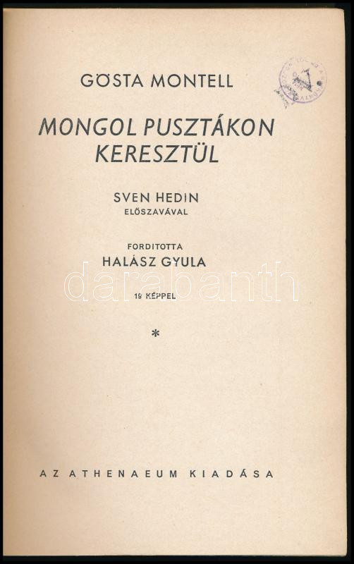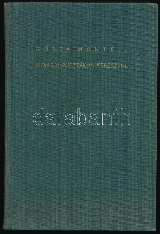 Gösta Montell: Mongol pusztákon keresztül. Sven Hedin előszavával. Ford.: Halász Gyula. Ismeretlen Világok. Bp.,1938, Athenaeum. Egészoldalas fekete-fehér képekkel illusztrált. Kiadói egészvászon-kötés, kissé fakó gerinccel, a borítón kis kopásnyomokkal, a hátsó borító felső része fakult.