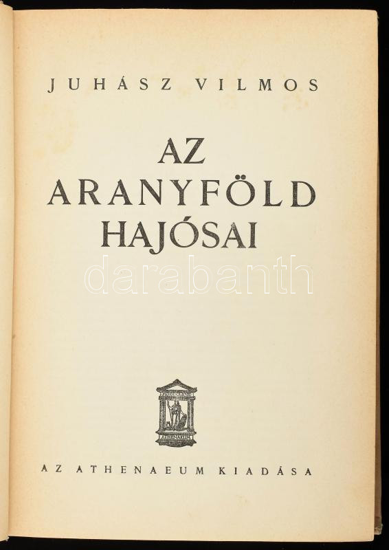 Juhász Vilmos: Az aranyföld hajósai. Bp., [1936], Athenaeum, 275+(1) p... https://www.darabanth.com/hu/475-Gyorsarveres/475.0/Konyvek/Konyvek-Utazas-helytortenet~2000027/Juhasz-Vilmos-Az-aranyfold-hajosai-Bp-1936-Athenaeum-275plus1-pplus-8-t-Kiadoi-egeszvasz~II3225317
