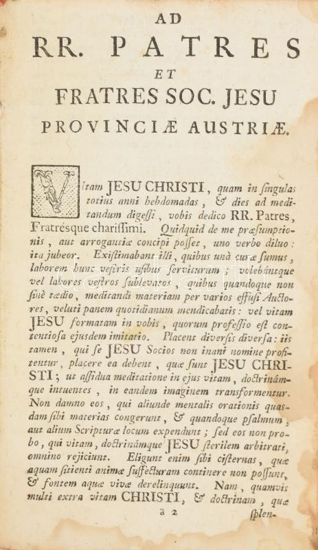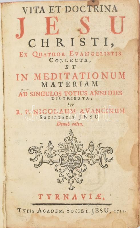 Avancinus, Nicolaus: Vita et doctrina Jesu Christi, ex quatuor evangelistis collecta, et in meditationum materiam ad singulos totius anni dies distributa, per R. P. - -. Tyrnaviae [Nagyszombat], 1751, Typiis Academ. Societ. Jesu, 28+418 p. Latin nyelven. Korabeli egészbőr-kötésben, kopott borítóval, sérült hátsó táblával, sérült gerinccel, a gerincen címkével, az utolsó lapon kis sérüléssel, egy lap hiánnyal (419/420), foltos.