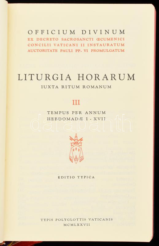 Typis Polyglottis... https://www.darabanth.com/hu/475-Gyorsarveres/475.0/Konyvek/Konyvek-Vallas~1000031/Liturgia-Horarum-iuxta-ritum-romanum-I-IV-Teljes-Typis-Polyglottis-Vaticanis-1974-Aranyozott-e~II3230850