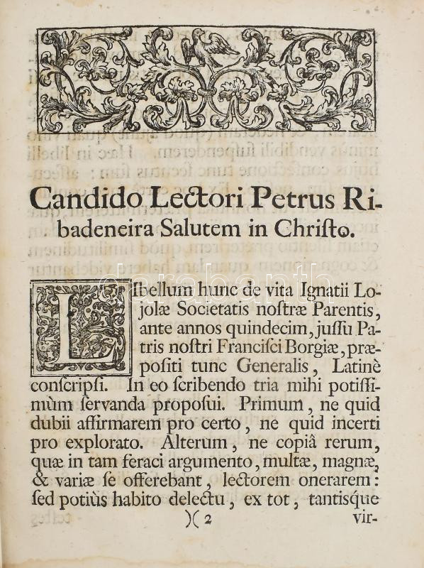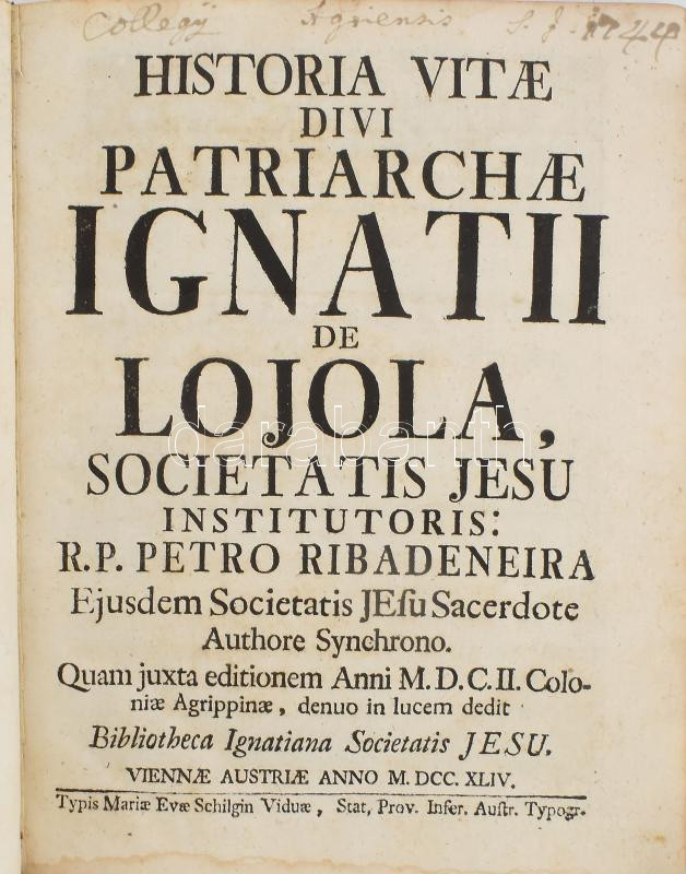 [Pedro de Ribadeneira (1527-1611) Petrus Ribandeneira: Historia vitae divi Patriarchae Ignatii de Lojola, Societatis Jesu institutoris:... Viennae Austriae, 1744.,Typis Maria Evae Schilgin Viduae, 14+336+20 p. Latin nyelven. Korabeli bordázott egészbőr-kötés, a gerincen címkékkel, kopott borítóval, a gerinc felső részén hiánnyal, foxing foltos lapokkal, címképhiánnyal.