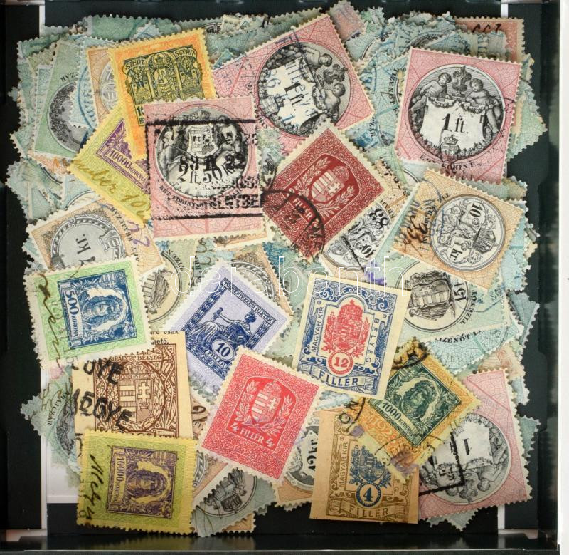 Leírás: 1868-1934 Több, mint 400 db régi okmánybélyeg, bonbonos dobozban ömlesztve