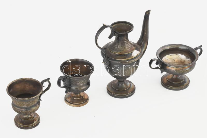 Leírás: Antik ezüstözött 4 részes szett, kiöntő, fűszerkínáló, 2 pohár, m: 15 cm alatt