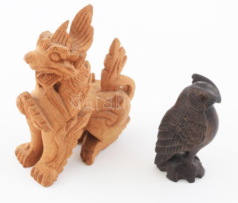 Leírás: Faragott sárkány és bagoly figura, m: 7,5-11 cm